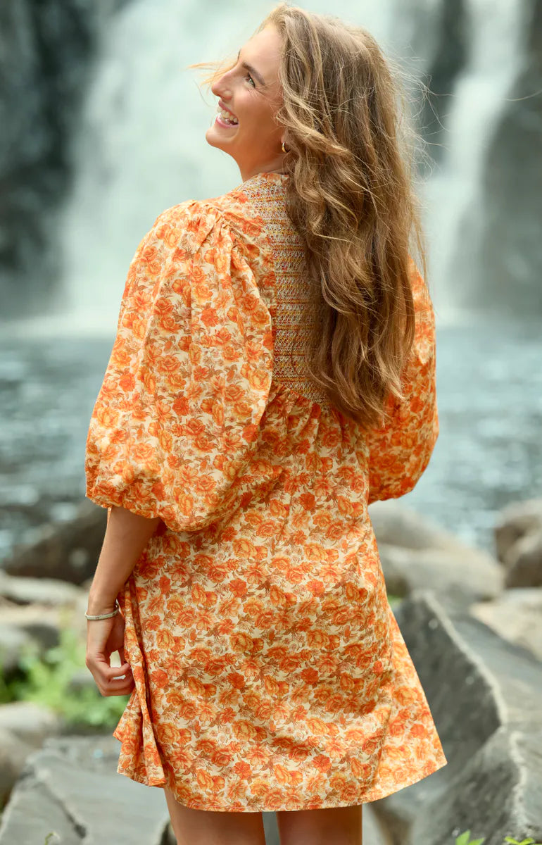 Så lekker kjole i mini-lengde og smocking på brystet og ryggen. Ballongermer.