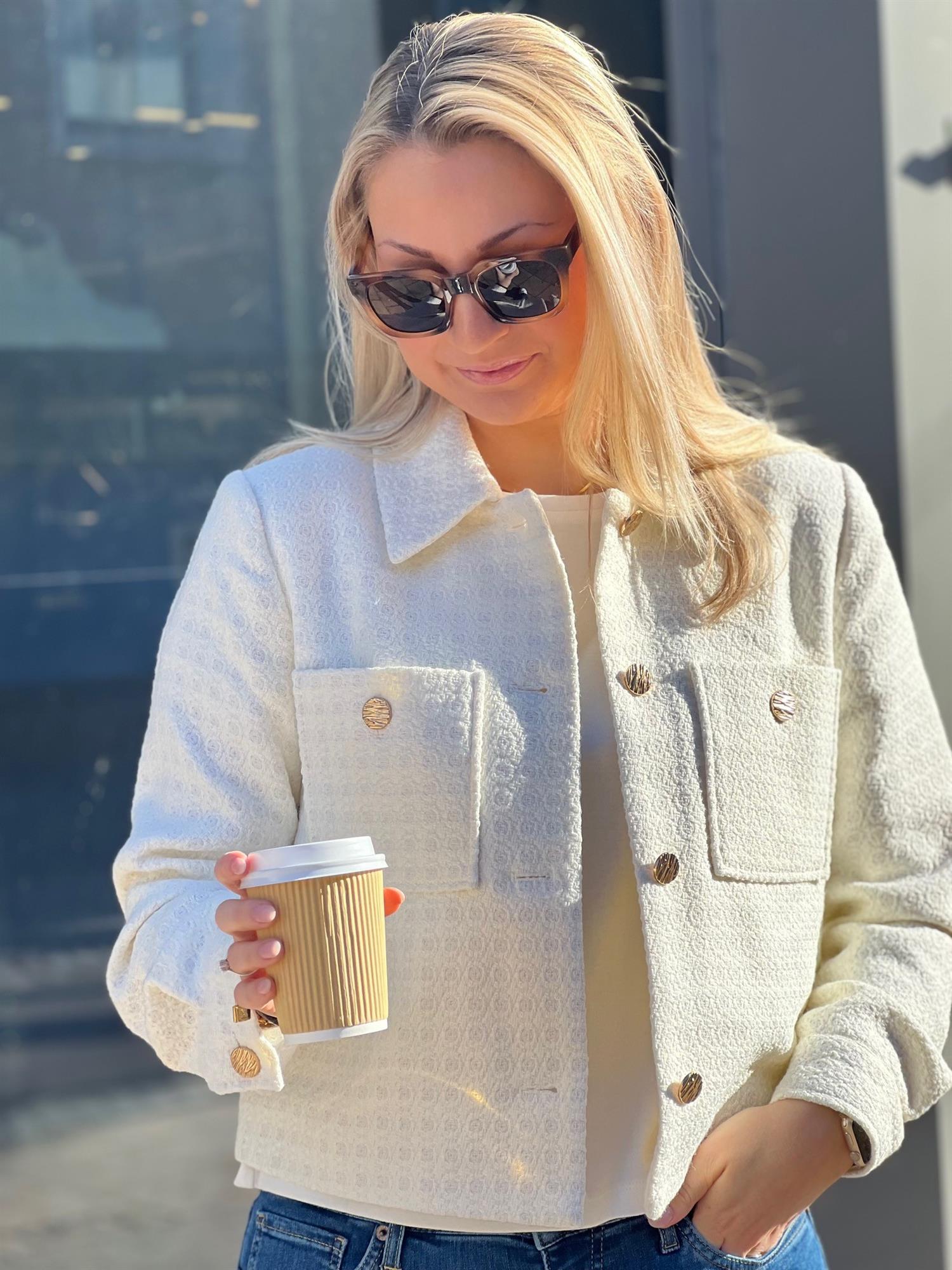 Jakke i 100% polyester. Knepping foran med metalliske knapper.