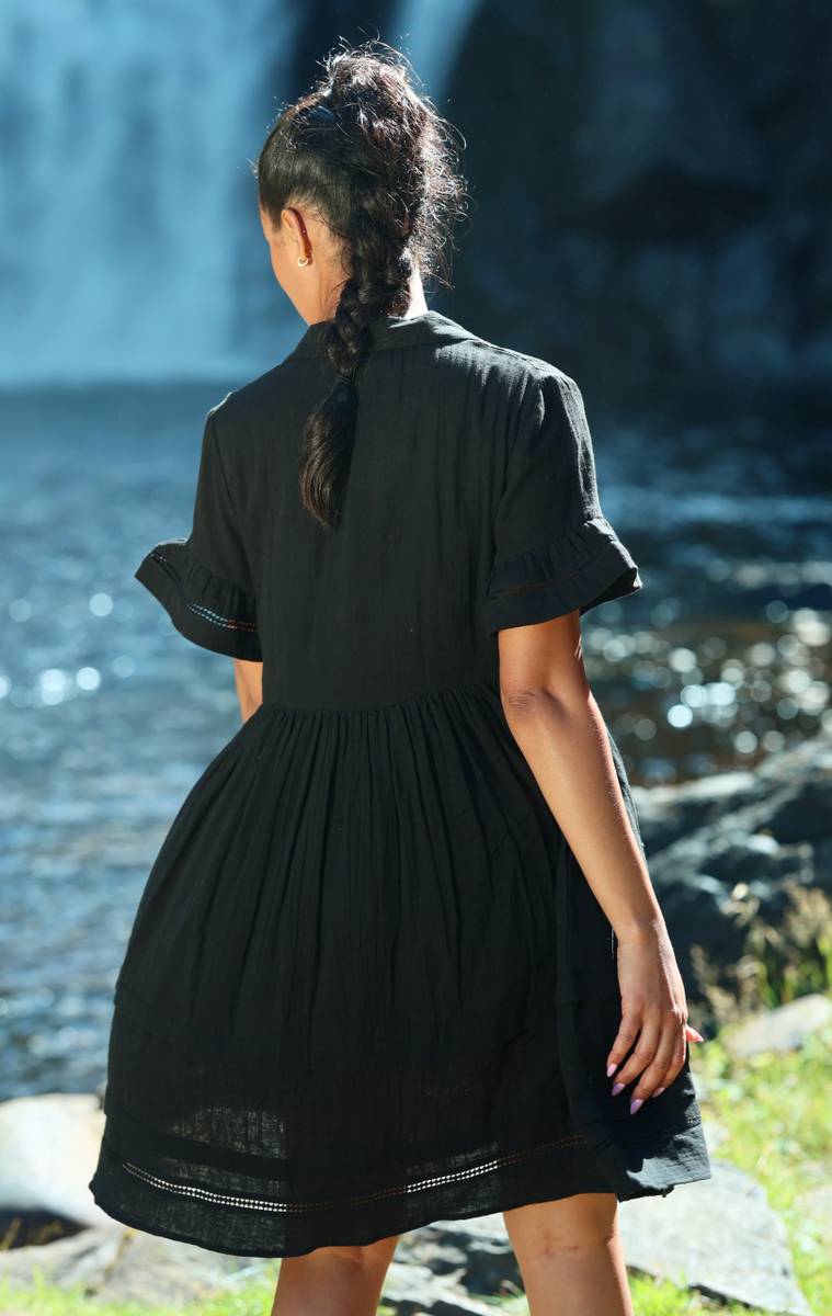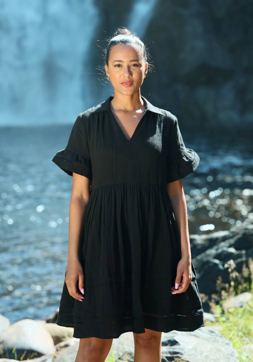 Helt fantasisk kjole med mini lengde. Kjolen har V-hals med skjortekrage nydelig hullbroderi nederst på erm og skjørt. Kommer med løst belte. Lommer i sidene.