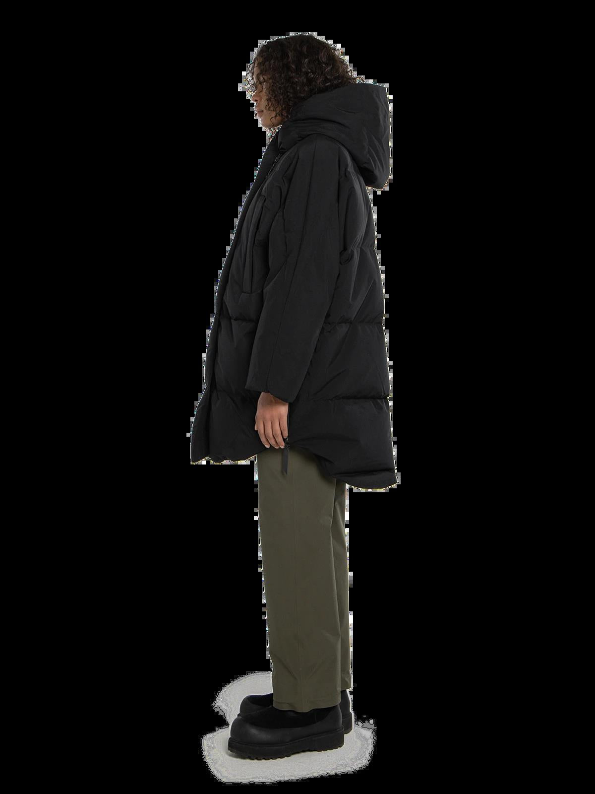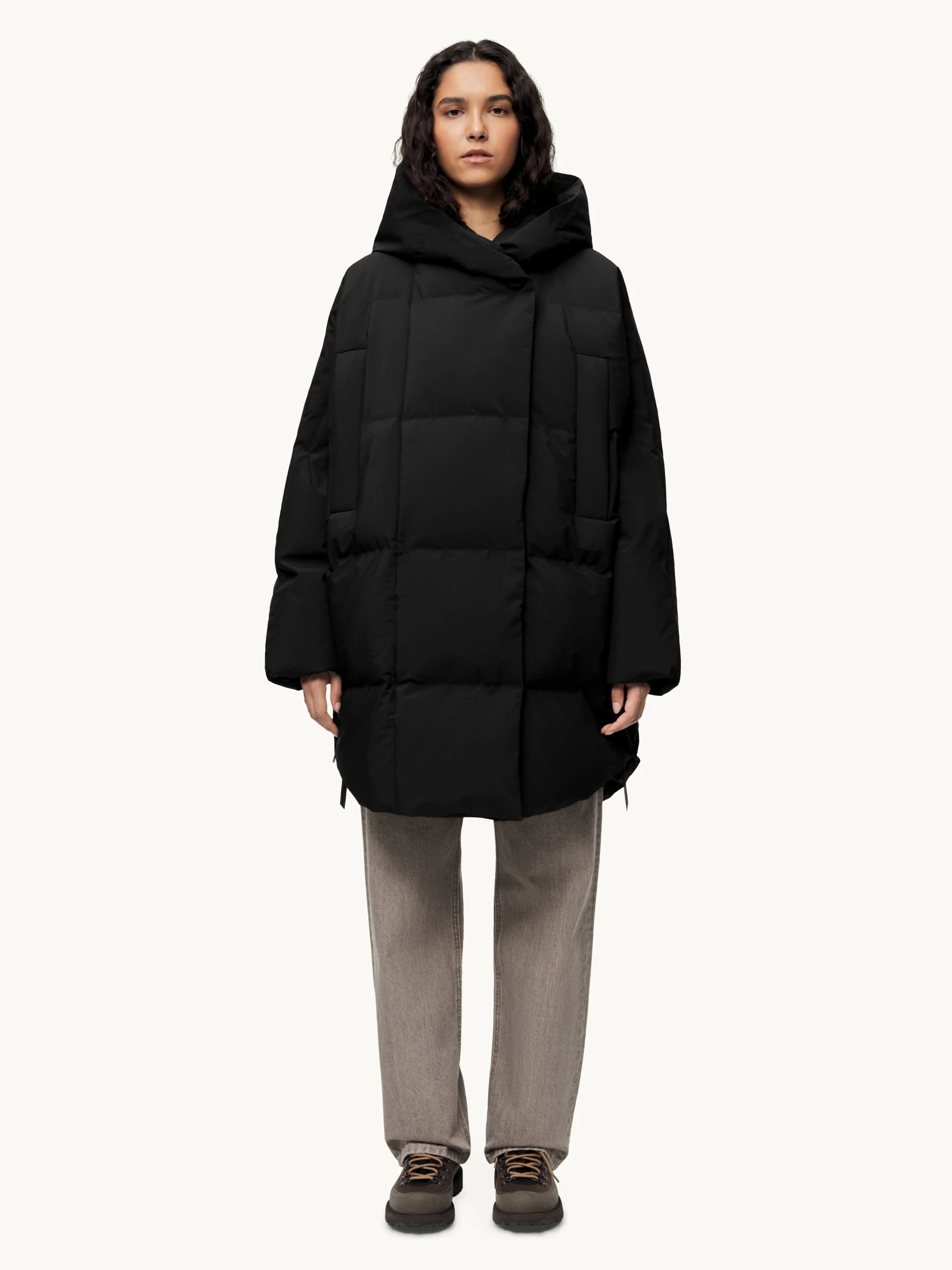 This women's down jacket is a fusion of style and functionality, inspired by our bestselling poncho. It’s warm and waterproof, and comes with a removable belt.
