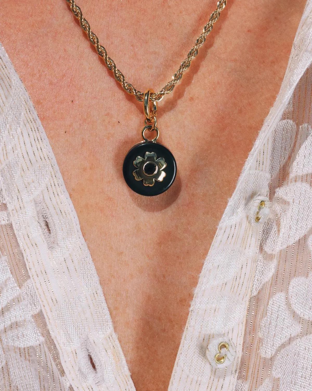 The Black Flower is part of byTiMo Fine Bijouterie Collection. With the right vintage touch, this fun, limited edition collection will give joy and life to any girl’s wardrobe. Each charm has a purpose, allowing you to create the combination reflecting your uniqueness, and personal style. Symbol of Strength, The Black Flower embodies the power and resilience that shine through our lives and celebrates our achievments. The Black Flower is 14 carats, 0.25 Micron gold plated, and will therefore hold the test of time if the wearer shows the pieces love and attention. The Black Flower can be worn on The Bracelet or one of our necklaces, and combined with other charms of the Collection, for a unique Bijouterie piece.