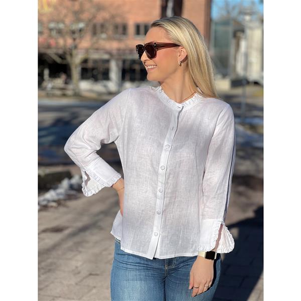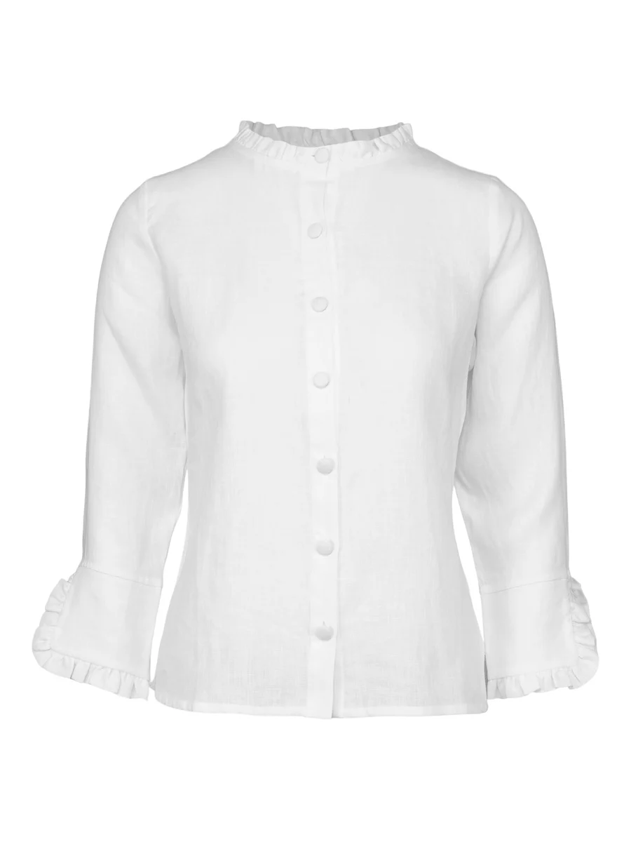 Skjorten i 100% lin har en slim fit, med vakre volangdetaljer i halsen og ermer med knapper helt ned foran.