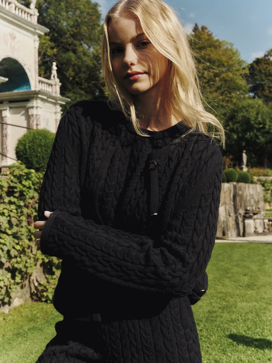 Ulla Cotton Jacket i 100% økologisk bomull er en elegant kabelstrikket cardigan med en klassisk look med dekorative monogramknapper og falske lommer, gir den et elegant og stilig utseende. Med en rett passform, lange ermer og en rund hals gir denne jakken både komfort og tidløs appell.