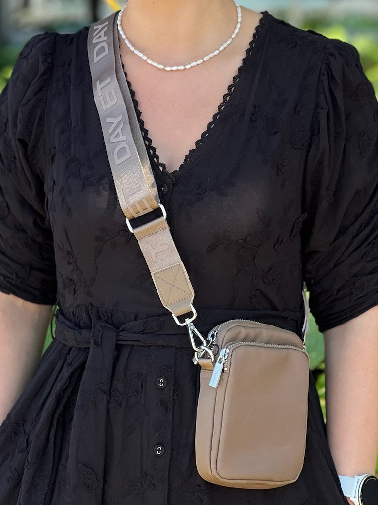 Day RE-Logo Band Compact Mini er perfekt for oppbevaring av mindre gjenstander. Vesken er laget av 100 % resirkulert materiale i hovedstoffet. Den lukkes med glidelås og i hovedrommet er det plass til dine viktigste must-haves. Vesken har gulldetaljer som DAY ET-logoen og glidelåsen. Den har en avtagbar og justerbar stropp, slik at du kan få akkurat den passformen du ønsker. Høyde 19cm, lengde 23cm og bredde 5 cm.