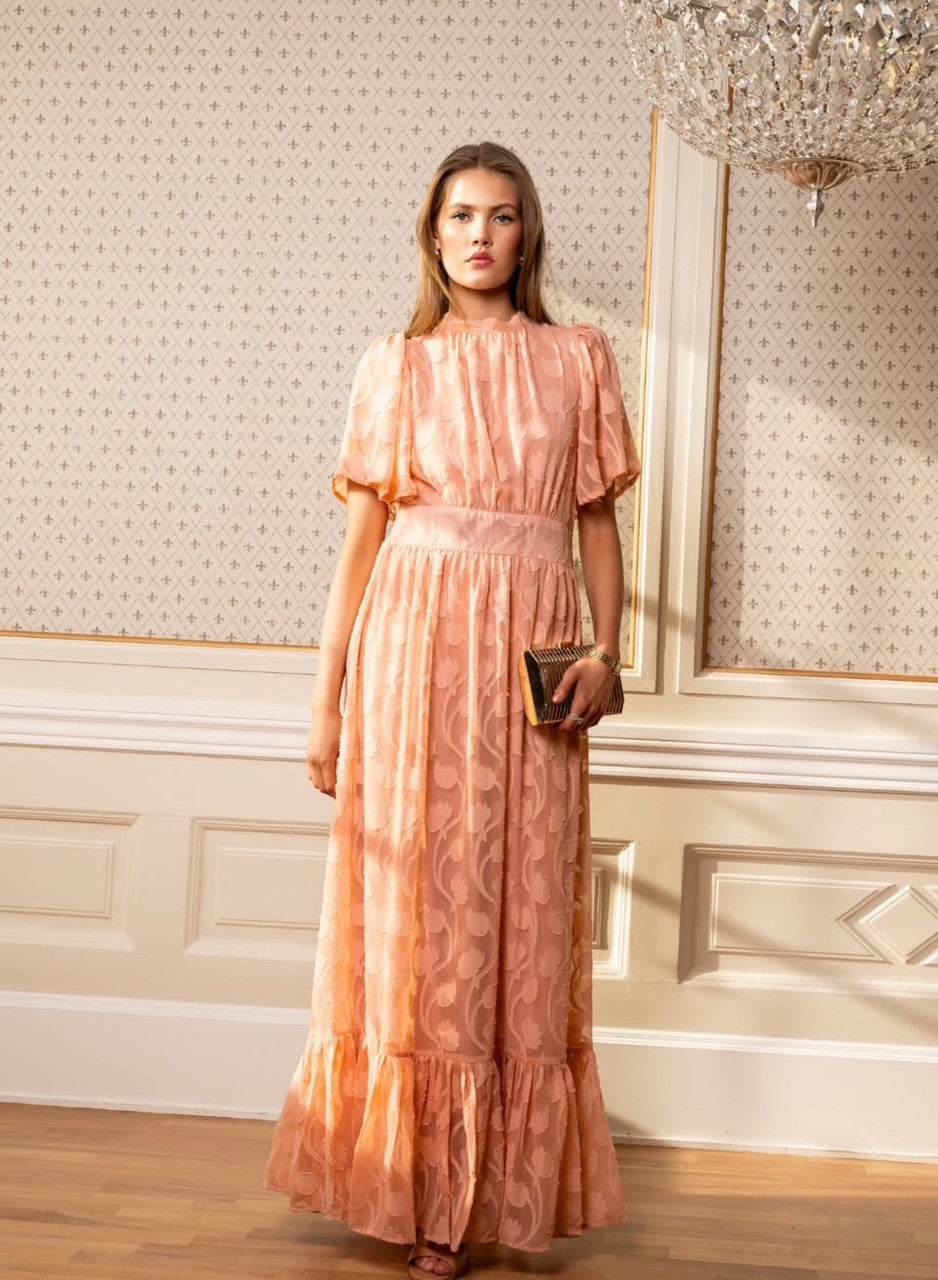 A wedding favourite - Heena Soft Peach in polyester georgette quality. This dress has a maxi length, and a fitted waistline made of smocking in the back for the perfect silhouette. It has loose elbow-length sleeves and the neckline ties into a pretty bow in the back. A slight opening in the back gives this dress an extra feminine touch, and it also has flounce at the hemline for nice flow in the skirt. A comfortable, true-to-size fit. Choose your usual size.Material: 100% Polyester Georgette.