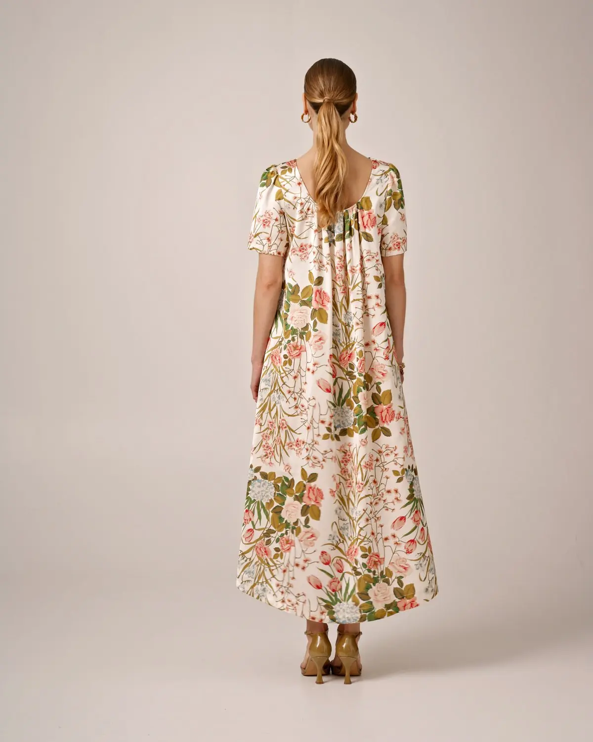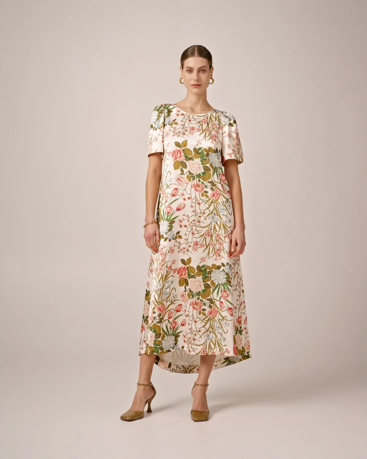The Tailored Satin Maxi Dress is cut in our structured, shiny and heavy FSC certified fabric. The dress has a ankle length, a-shaped silhouette, round collar and short squared sleeves.65% Rayon, 35% Polyester - FSC Certified.