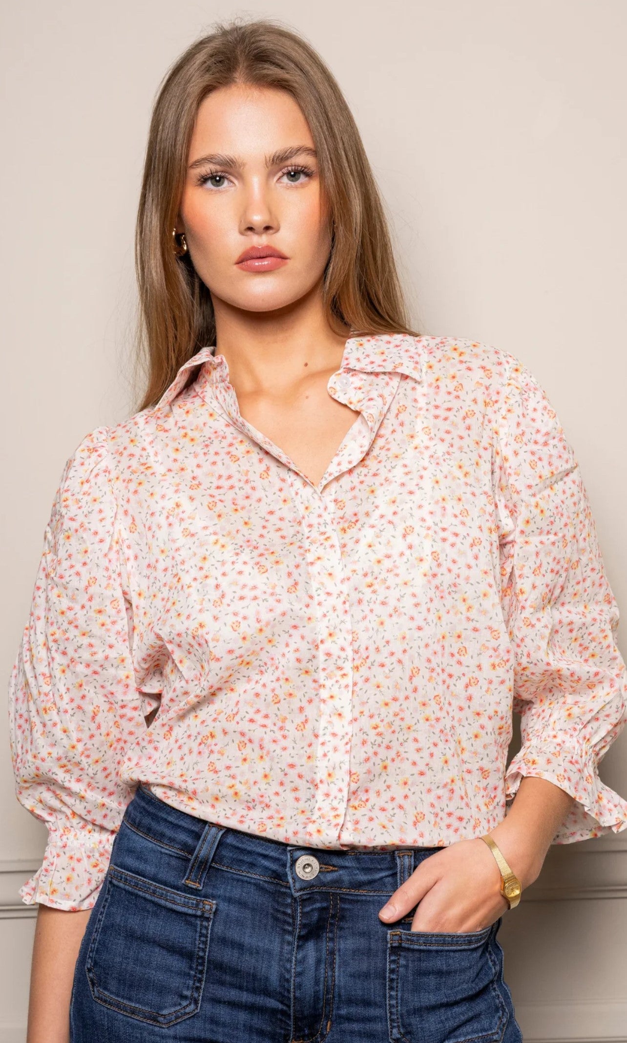 Breezy shirt from MISSMAYA. The Amy Shirt boasts comfortable cotton/linen quality and beautiful flower details. Ruffles and elastic along the cuffs, along with stylish puff sleeves, makes Amy the perfect choice for stepping up your everyday wear look!
