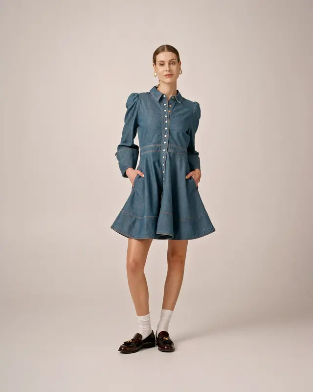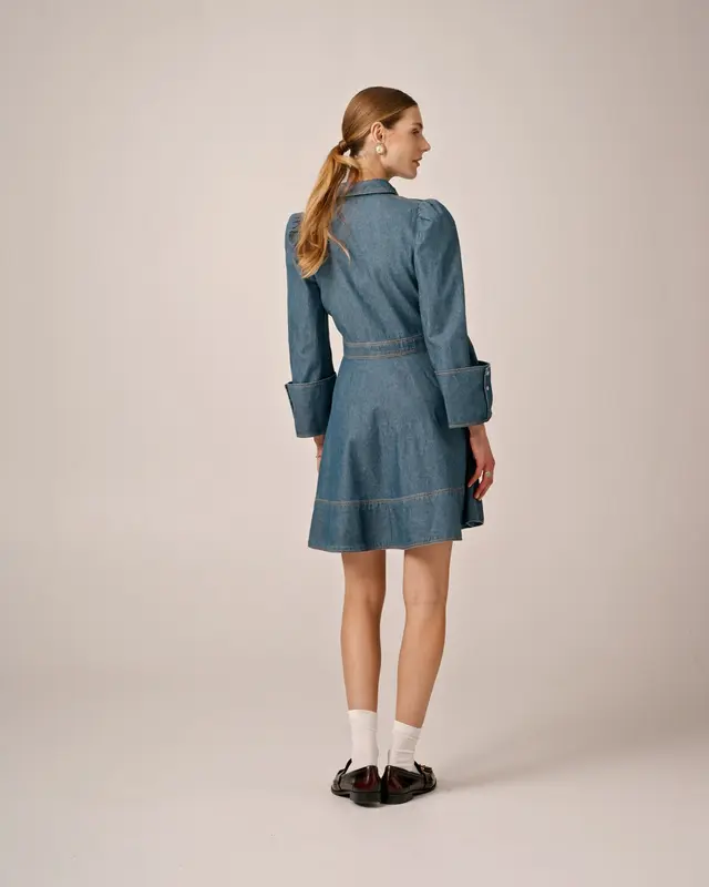 The Denim Mini Dress is cut in our slightly stretchy and soft GOTS certified cotton quality. The dress has a mini length, a shirt collar, fitted waistline, and three-quarter length sleeves with wide cuffs. The dress has press buttons down the front and a a-shaped skirt.68% Cotton, 32% Tencel - GOTS Certified.