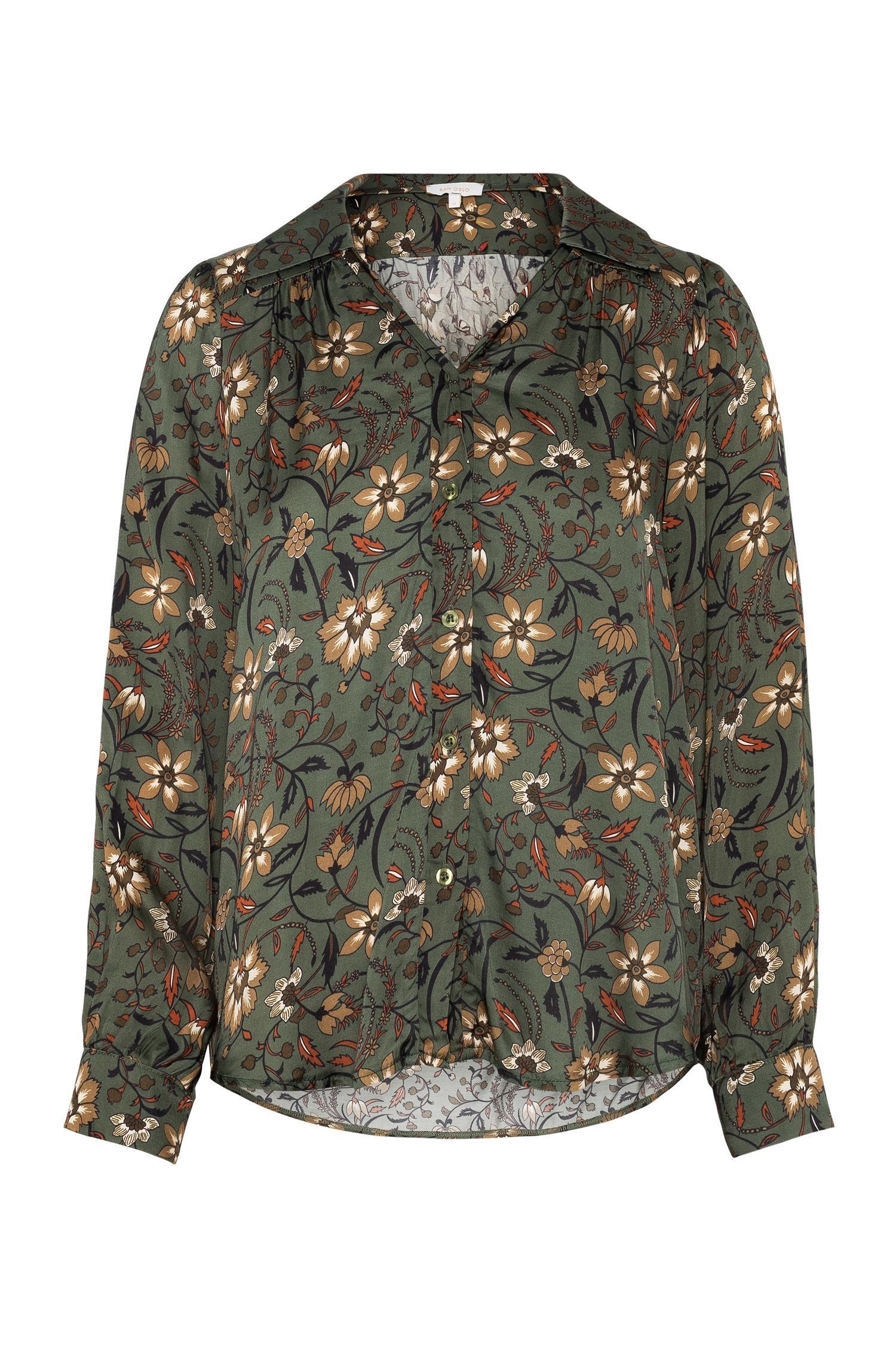 Blusen har en rett, klassisk fasong med krage og knepping i front. Den lette viskosekvaliteten gjør den behagelig å ha på, samtidig som det eksklusive printet gir antrekket det lille ekstra