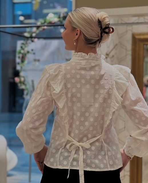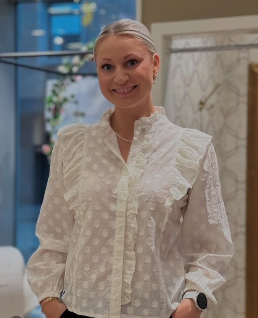 The Maya Blouse is made in our airy cotton quality. It has a loose fit, long voluminous sleeves with elastic cuffs, and ruffle details around the neck, shoulders and chest area. Combine with trousers or a skirt for a relaxed yet beautiful look!