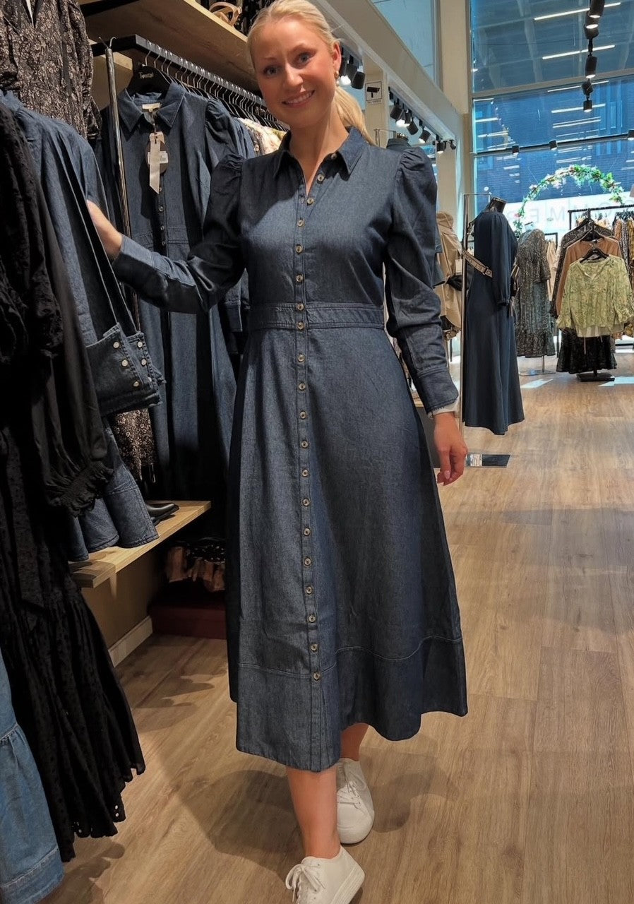 Denim kjole fra By TiMo i 100% bomull. Smal modell, så vipper du mellom to størrelser, gå gjerne opp en størrelse.