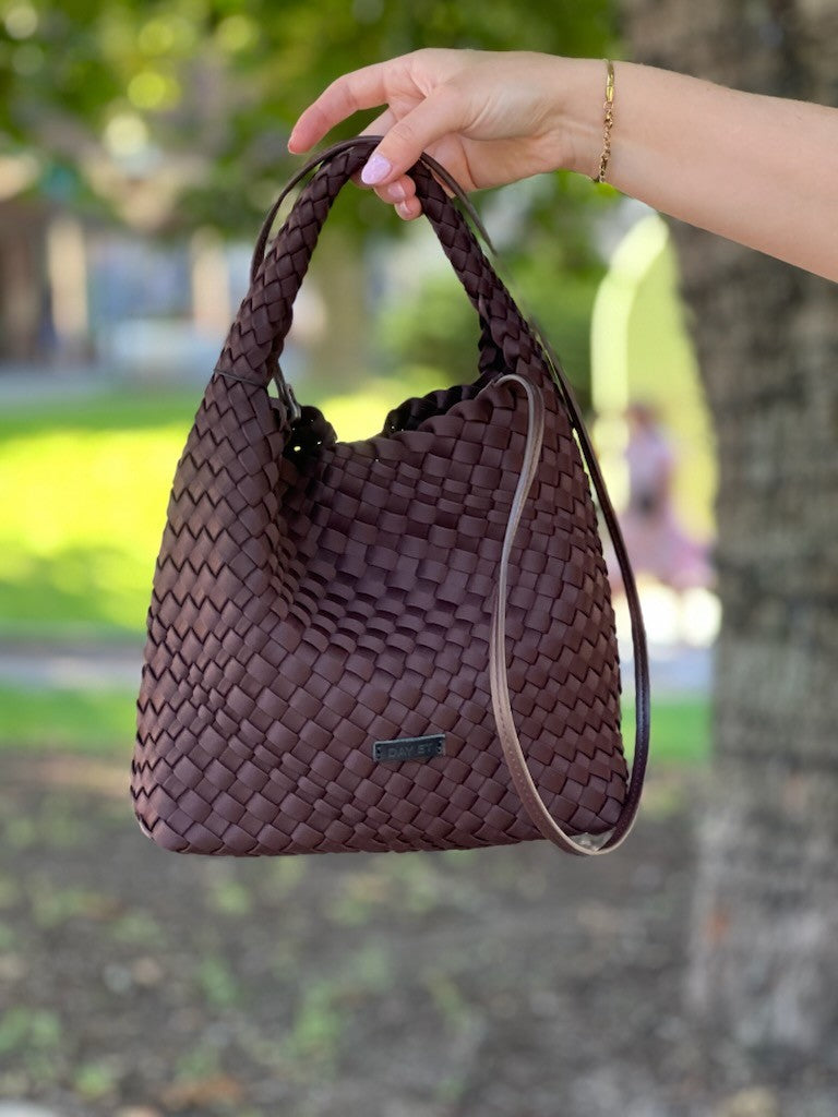 Denne håndvesken er laget i ett stykke av oppgradert neopren og har et unikt, håndflettet uttrykk som gir den akkurat passe edge. Materialet er mykt og fleksibelt, samtidig som den forsterkede bunnen sørger for at vesken holder formen. Den lukkes med en diskret magnetknapp og har en avtakbar stropp i skinnimitasjon – perfekt når du vil variere mellom håndveske og crossbody. Mål: H: 21cm / B: 22cm / D: 9cm