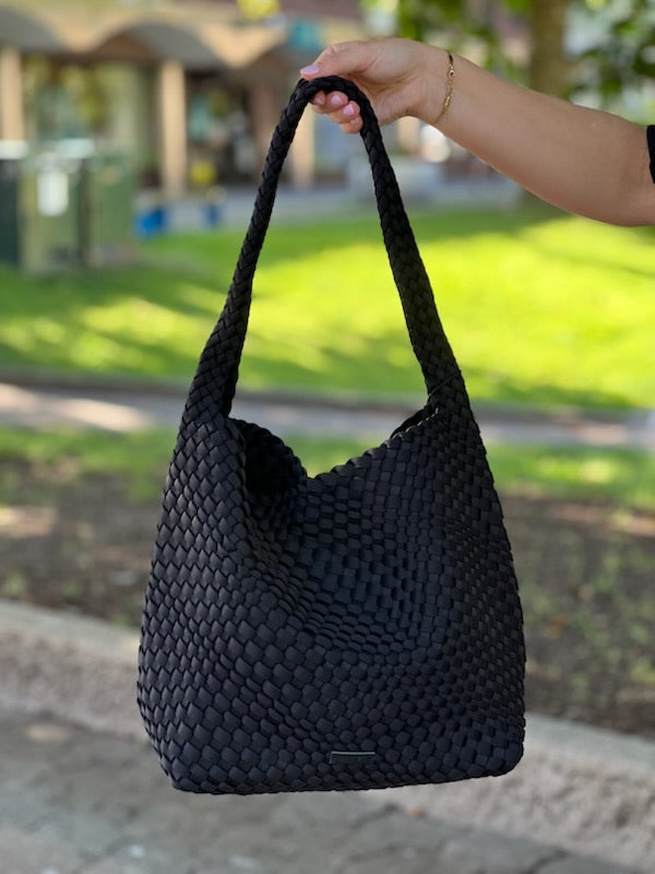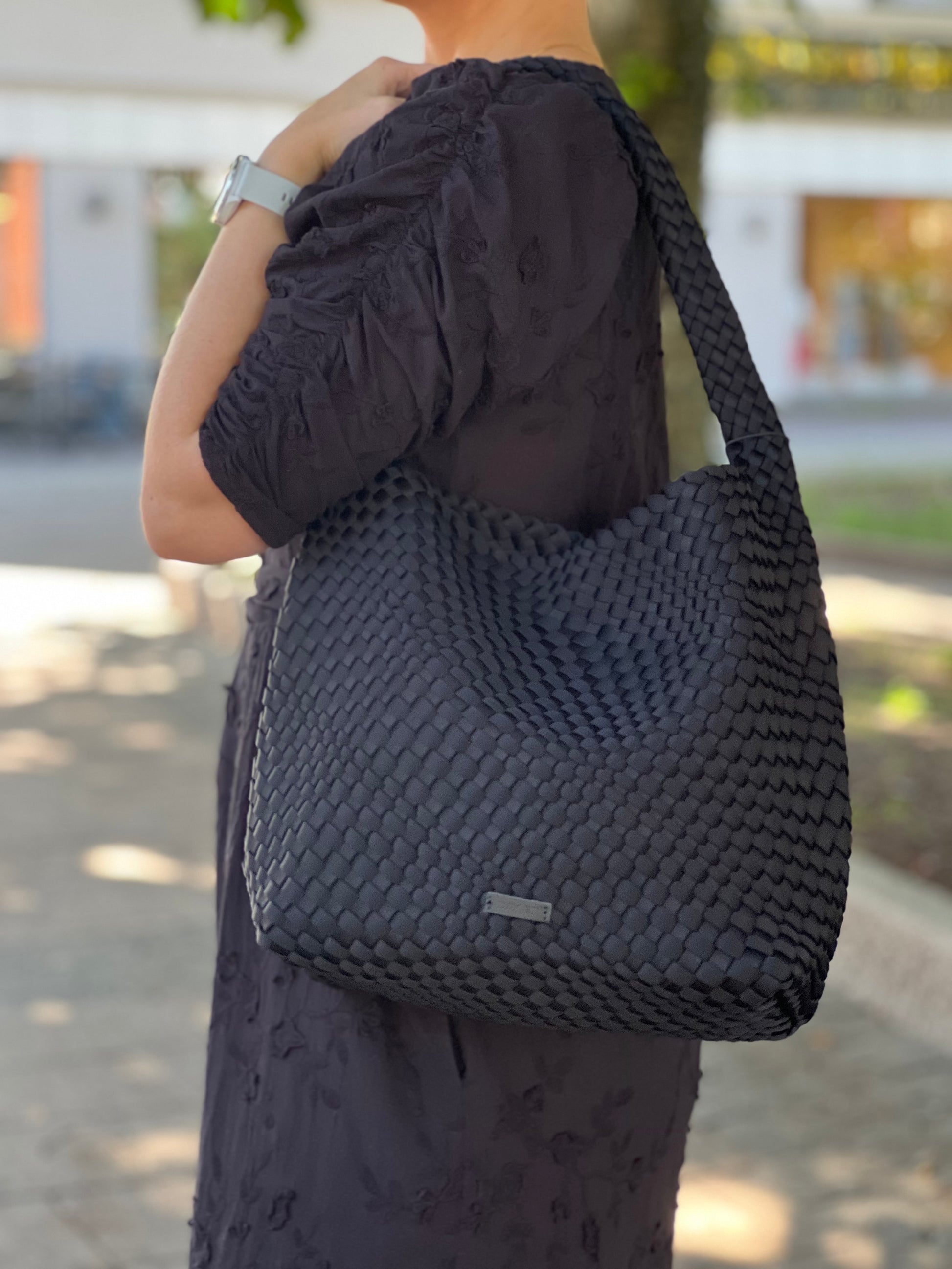 En romslig skulderveske i ett stykke neoprenmateriale som er både mykt og strukturert på samme tid. Den lukkes med en skjult magnet og har en fast bunn som sikrer en stabil form. En moderne veske som kombinerer funksjon. Høyde: 31cm, bredde 27cm og dybde15cm
