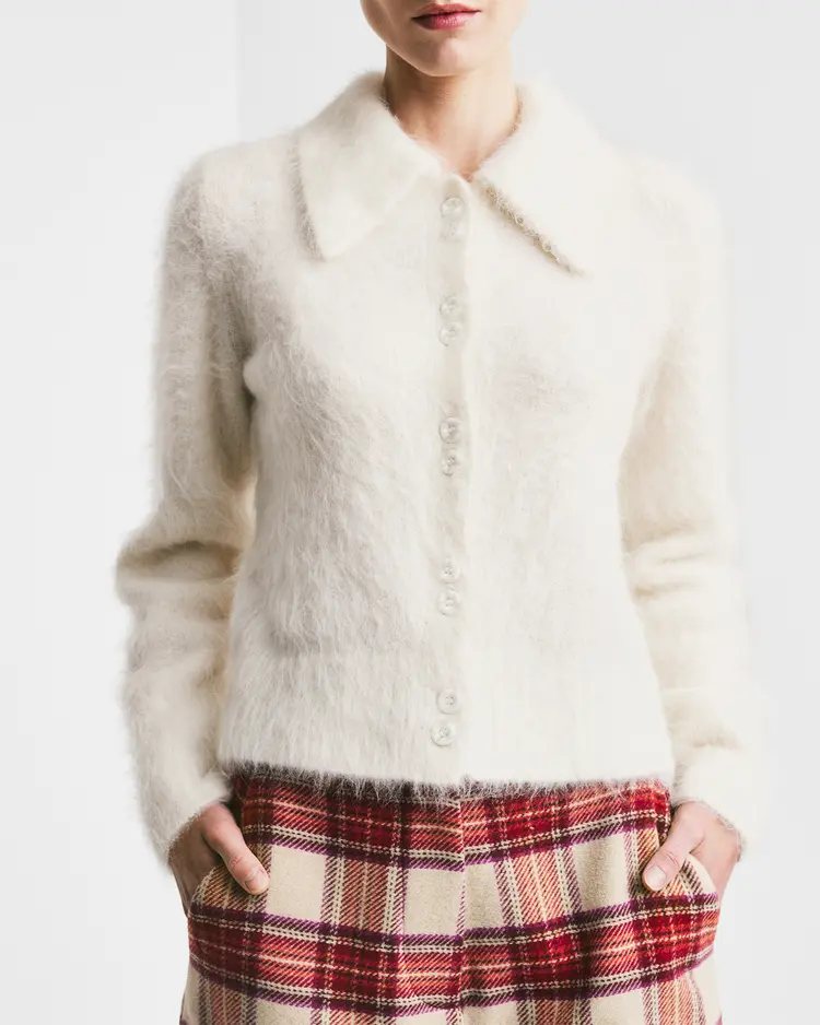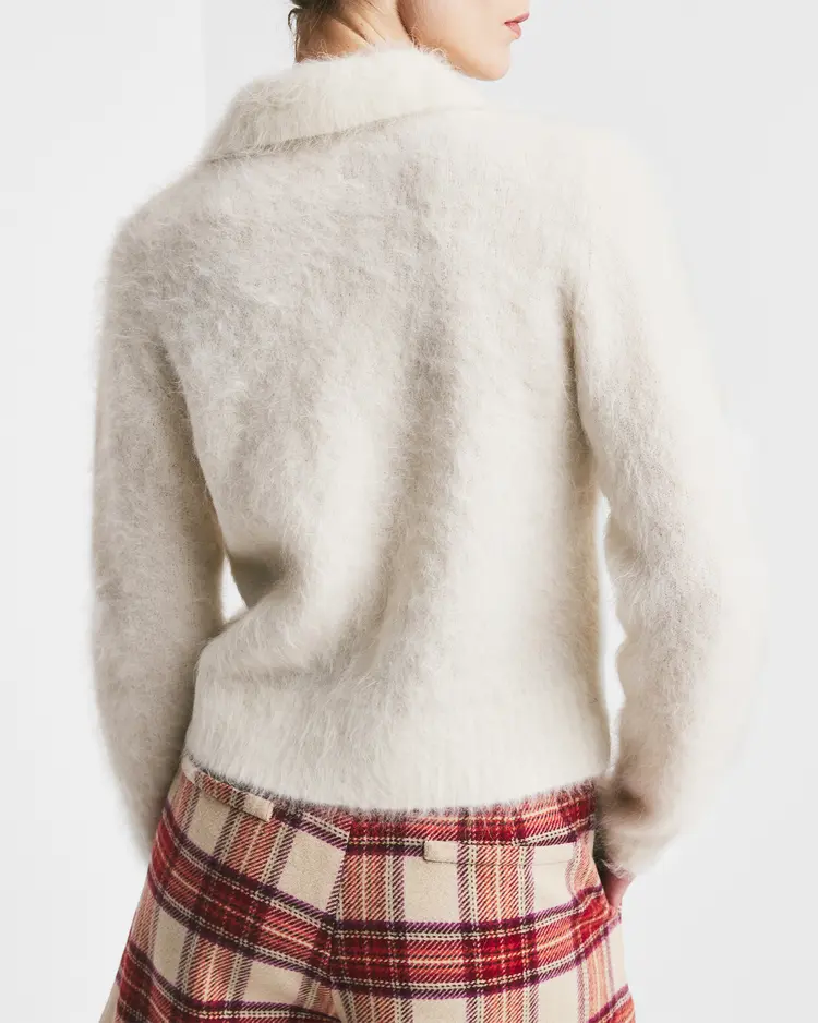The Hairy Knit Polo is made of our very soft and fuzzy blend of RAS certified yarn. The top has a straight silhouette, polo collar, long sleeves and buttons down the front. The cuffs, neckline and hemline have beautiful rib details