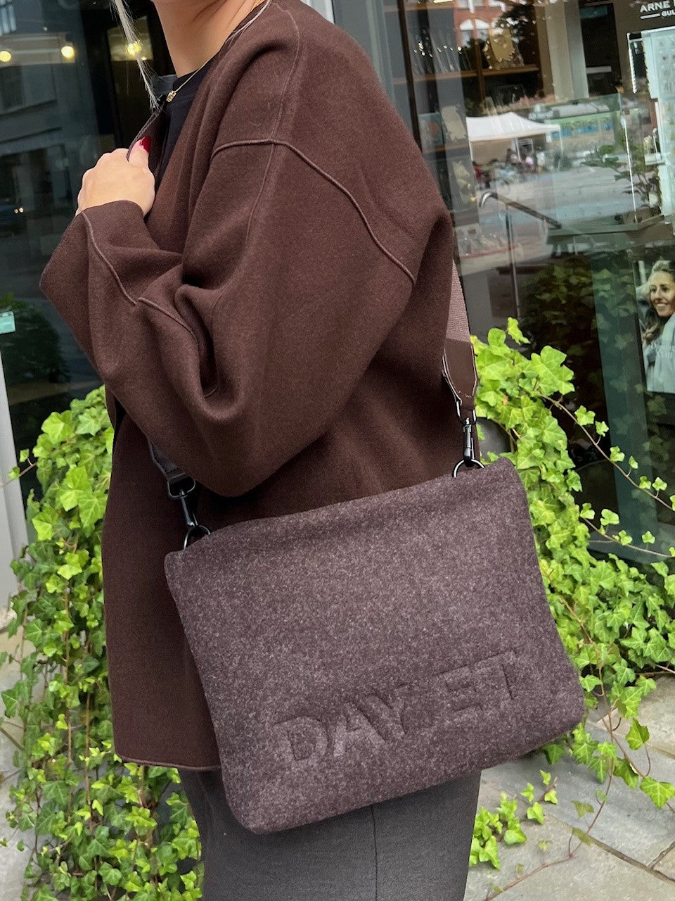 En allsidig veske i mykt ullmateriale som kan brukes som clutch eller crossbody. Den har nedsenket glidelås og en åpen innerlomme, og den justerbare, avtakbare stroppen gjør det enkelt å tilpasse den til dine behov. Et funksjonelt og stilig valg for både hverdagsbruk og stunder ute i det fri.