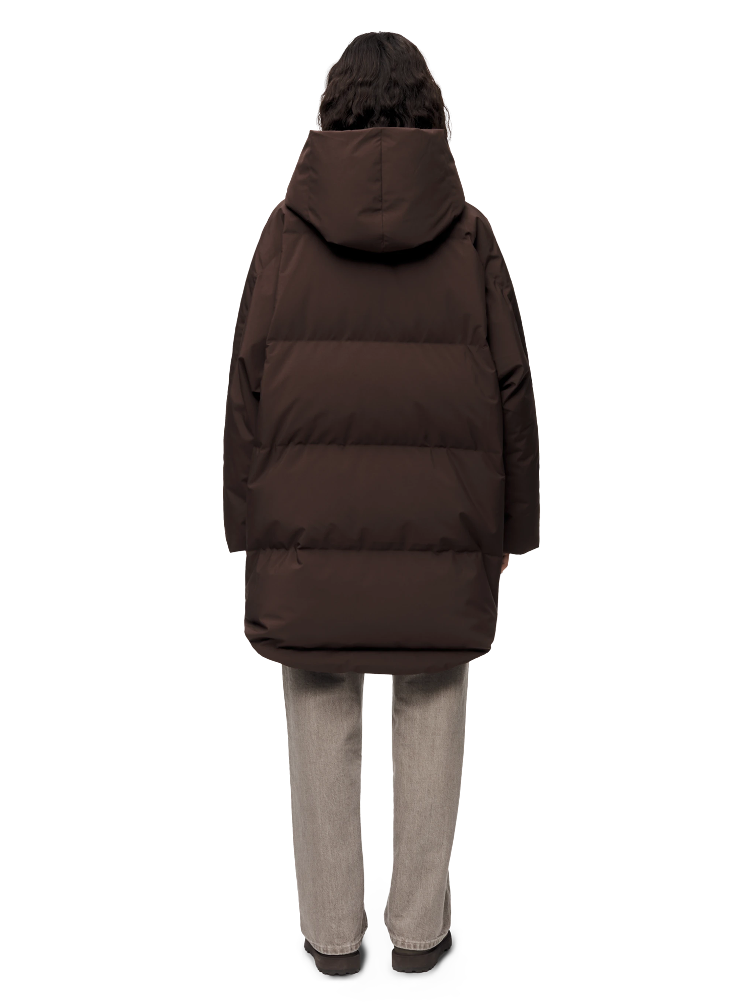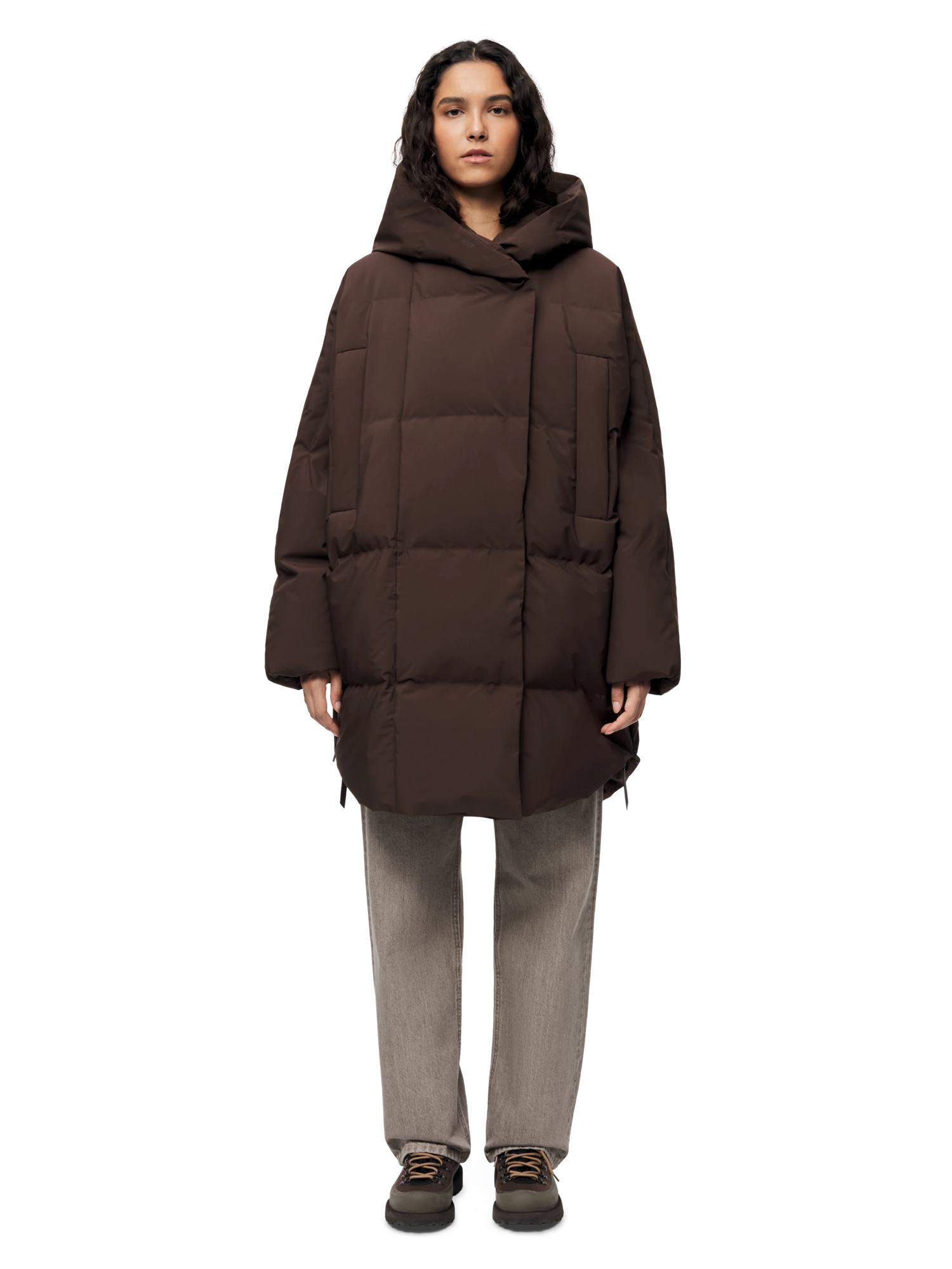 This women's down jacket is a fusion of style and functionality, inspired by our bestselling poncho. It’s warm and waterproof, and comes with a removable belt.
