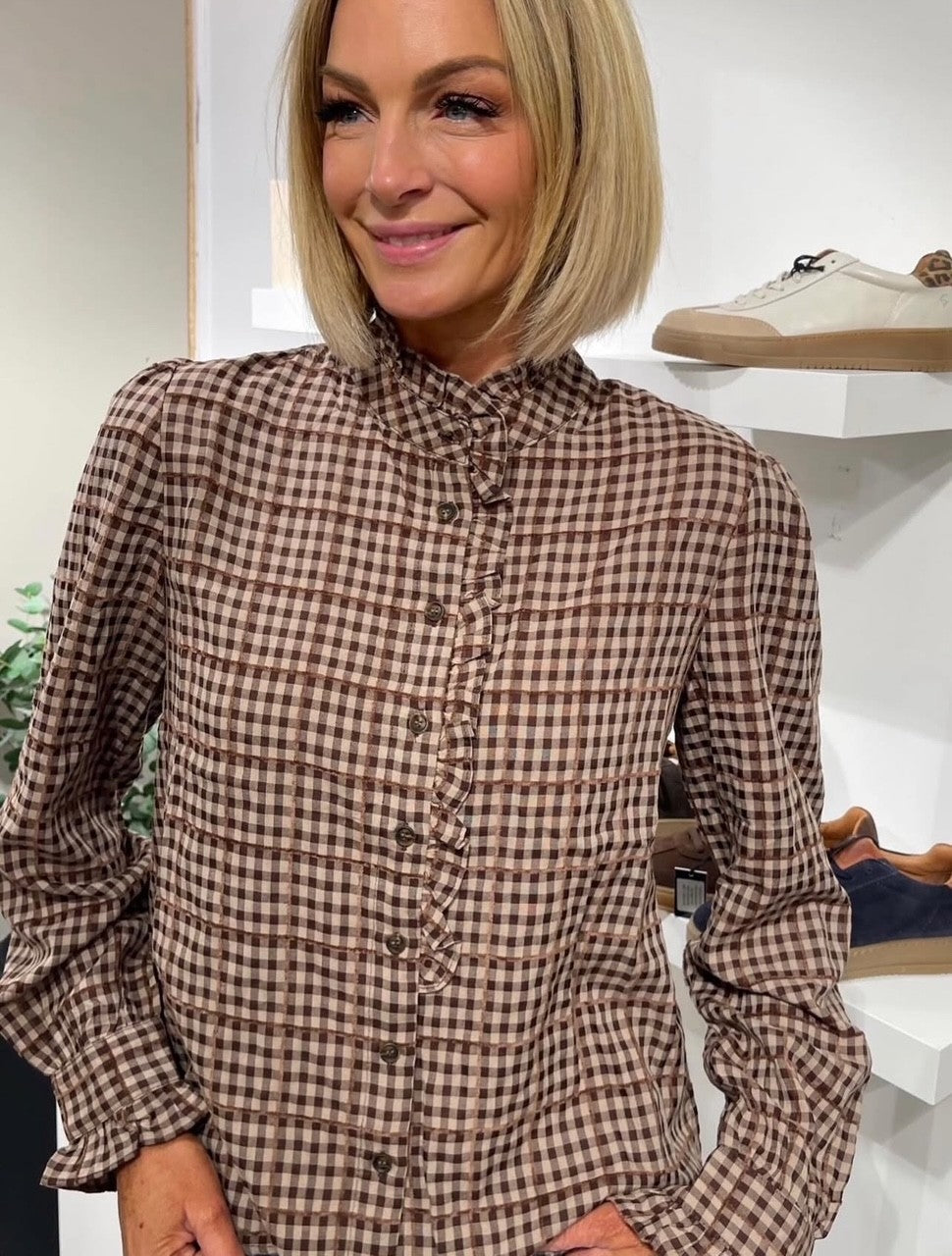Rutete skjortebluse i 50% viskose og 50% polyester.