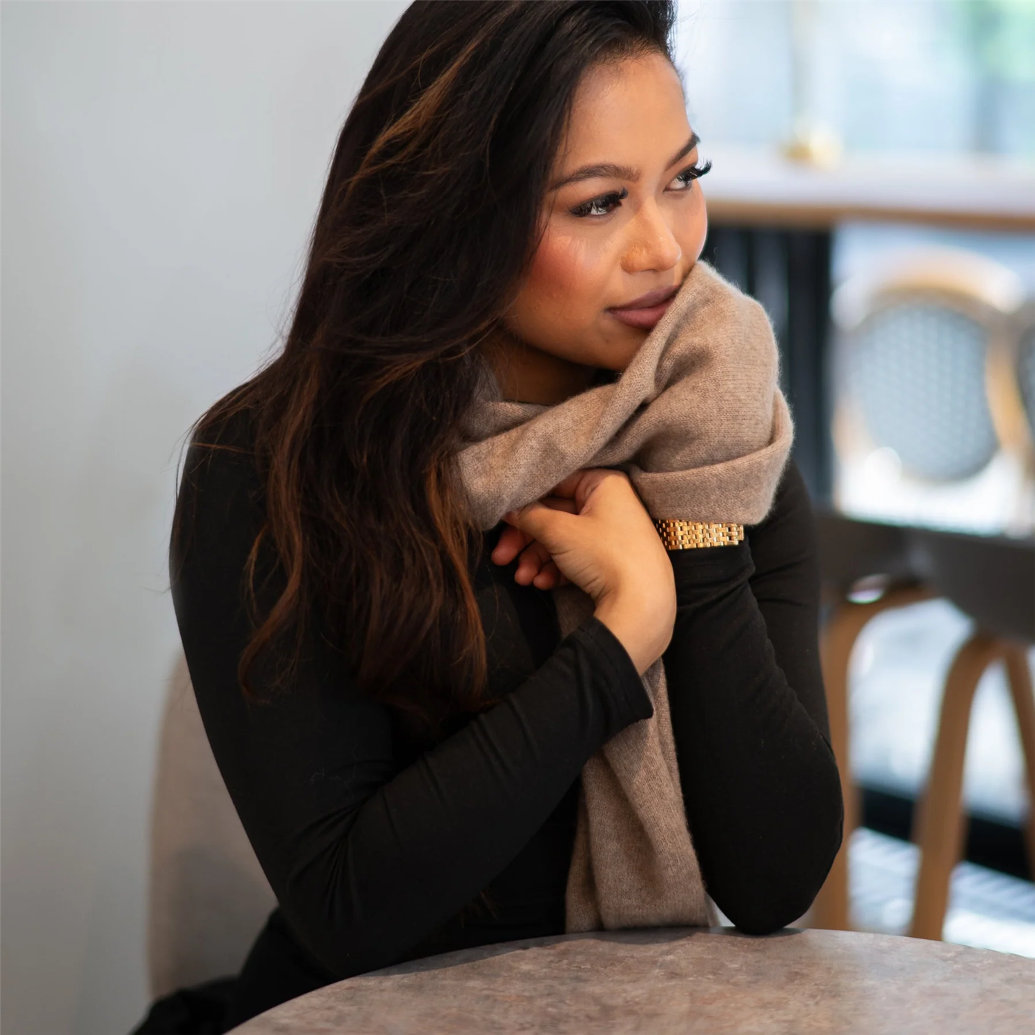 Elegant og tidløst skjerf i beige kashmir. Skjerfet er laget i 100% ren kashmir, det mykeste naturmaterialet. Kashmirull er et pustende materiale som er supermykt mot huden og holder deg god og varm. De nøye tilpassede målene er med på å gjøre skjerfet perfekt, da det ikke vil bli verken for stort eller for tungt å ha på seg. Dette myke skjerfet er designet for å vare og blir garantert din nye favoritt i høst og vintersesongen