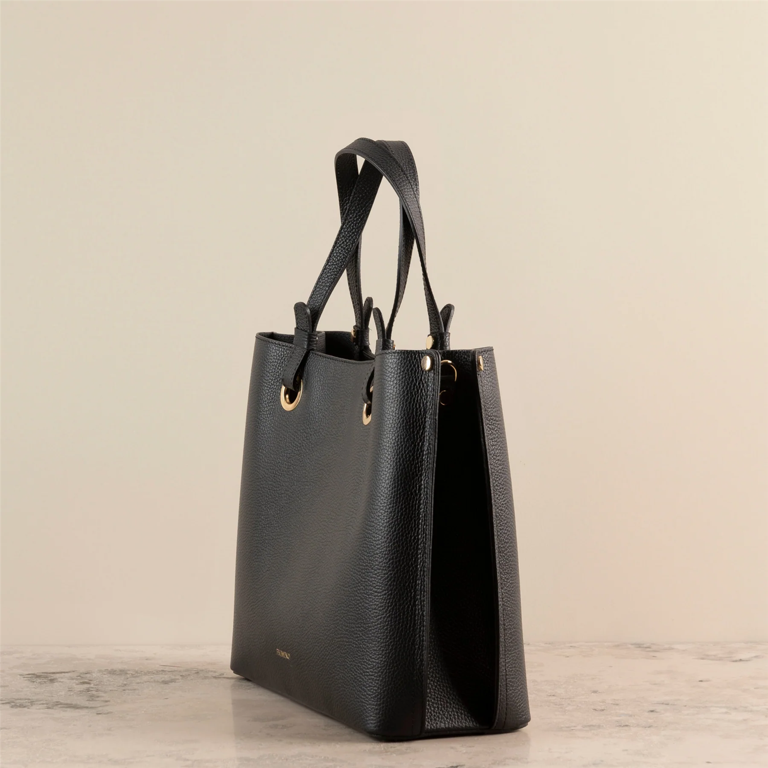 Bianca er en jobbveske i skinn med et klassisk design som passer til hverdagen. Perfekt til deg som vil ha noe unikt og stilsikkert som oser kvalitet. Bianca har en klassisk sort farge med elegante detaljer i gullfarget metall. Vesken har en justerbar stropp, som gjør at den også kan bæres behagelig på skulderen eller som crossbody. Innvendig har vesken to store rom, samt innvendig rom i midten med glidelås i gullfarge. I denne vesken får du god plass til bærbar PC 14 tommer og alt annet du trenger i løpet av dagen.