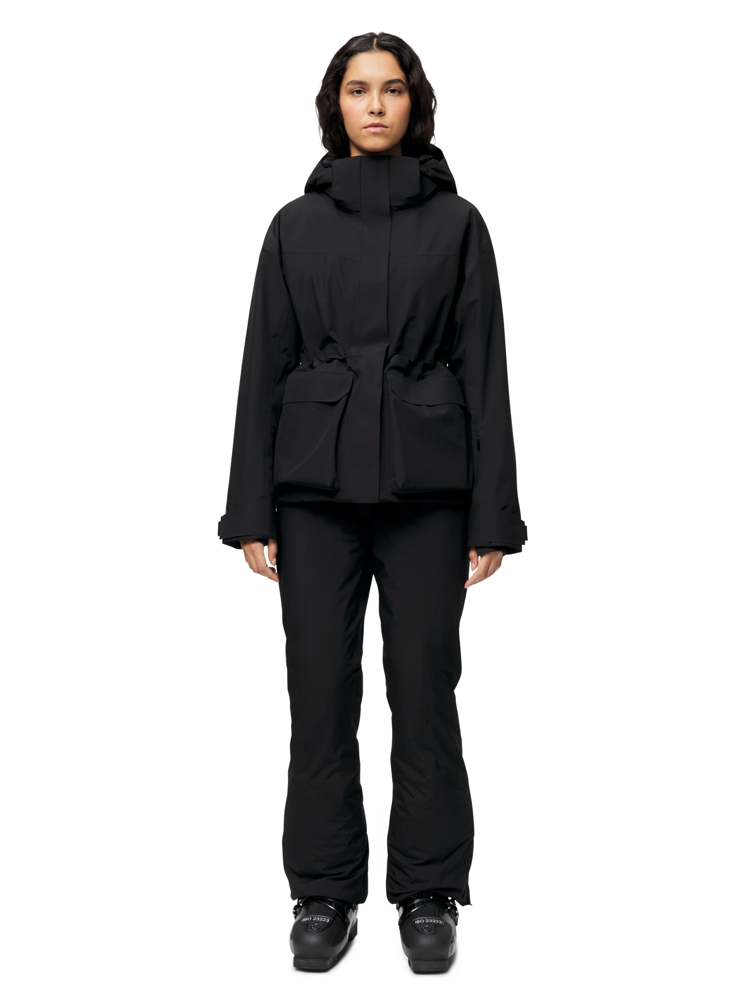 Skijakke for kvinner! Juvass-jakken er isolert og kombinerer ytelse med elegant design. Den er laget med Sorona® Aura-isolasjon og har en vanntetthetsklassifisering på 20 000 mm, noe som sikrer værbeskyttelse under alle forhold. Gjennomtenkte detaljer inkluderer en avtakbar hette, en komfortabel fleecefôret krage og en justerbar snøring i midjen for en skreddersydd passform. Den har også en skjult ermelomme for heiskort og en stropp av mikrofiberstoff for skibriller.