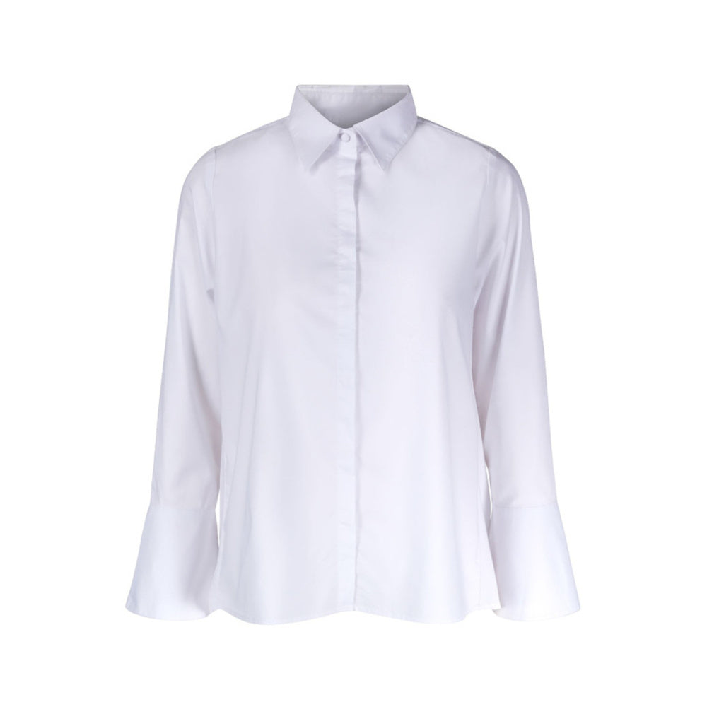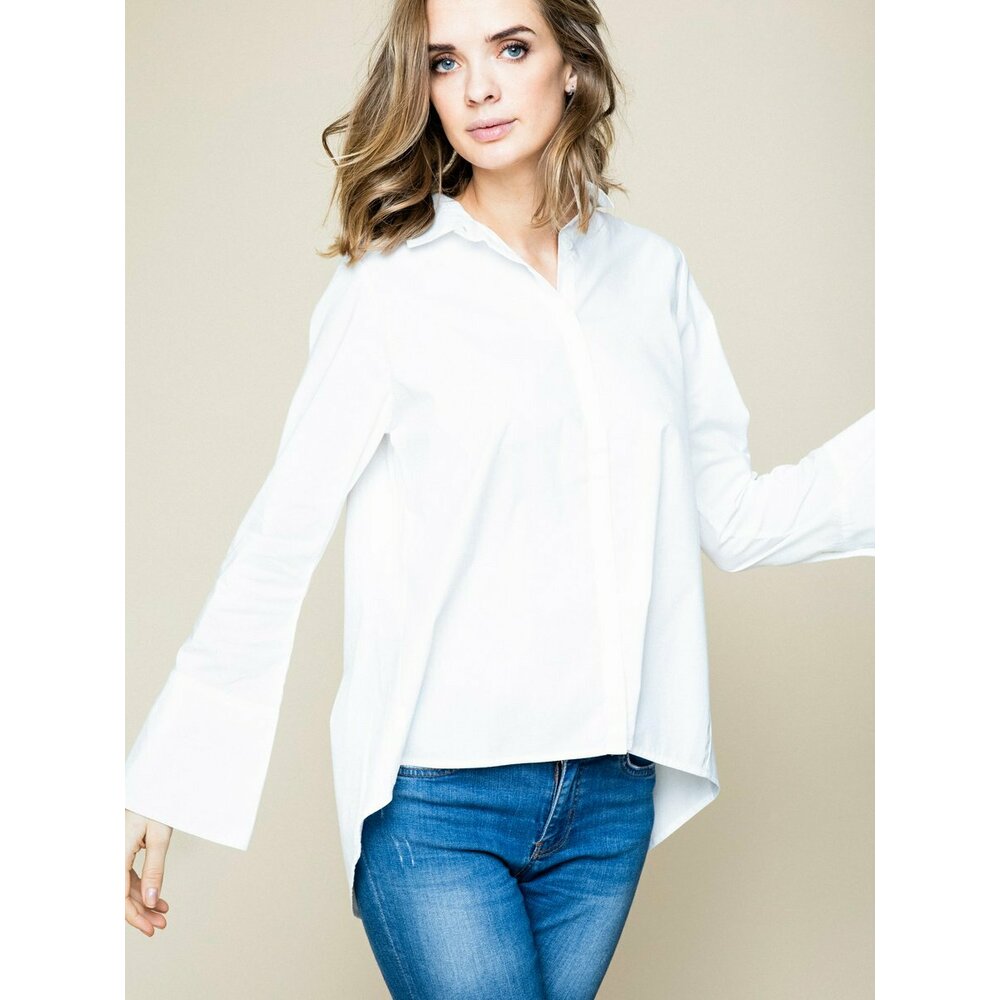 Juni skjorte er en oversized skjorte med vanlig krage. En asymmetrisk skjortekant som er lenger bak. Brede trompetermer. Farge: hvit Passform: oversized med trompetermer\nMateriale: 75% bomull, 23% polyester, 2% elastan