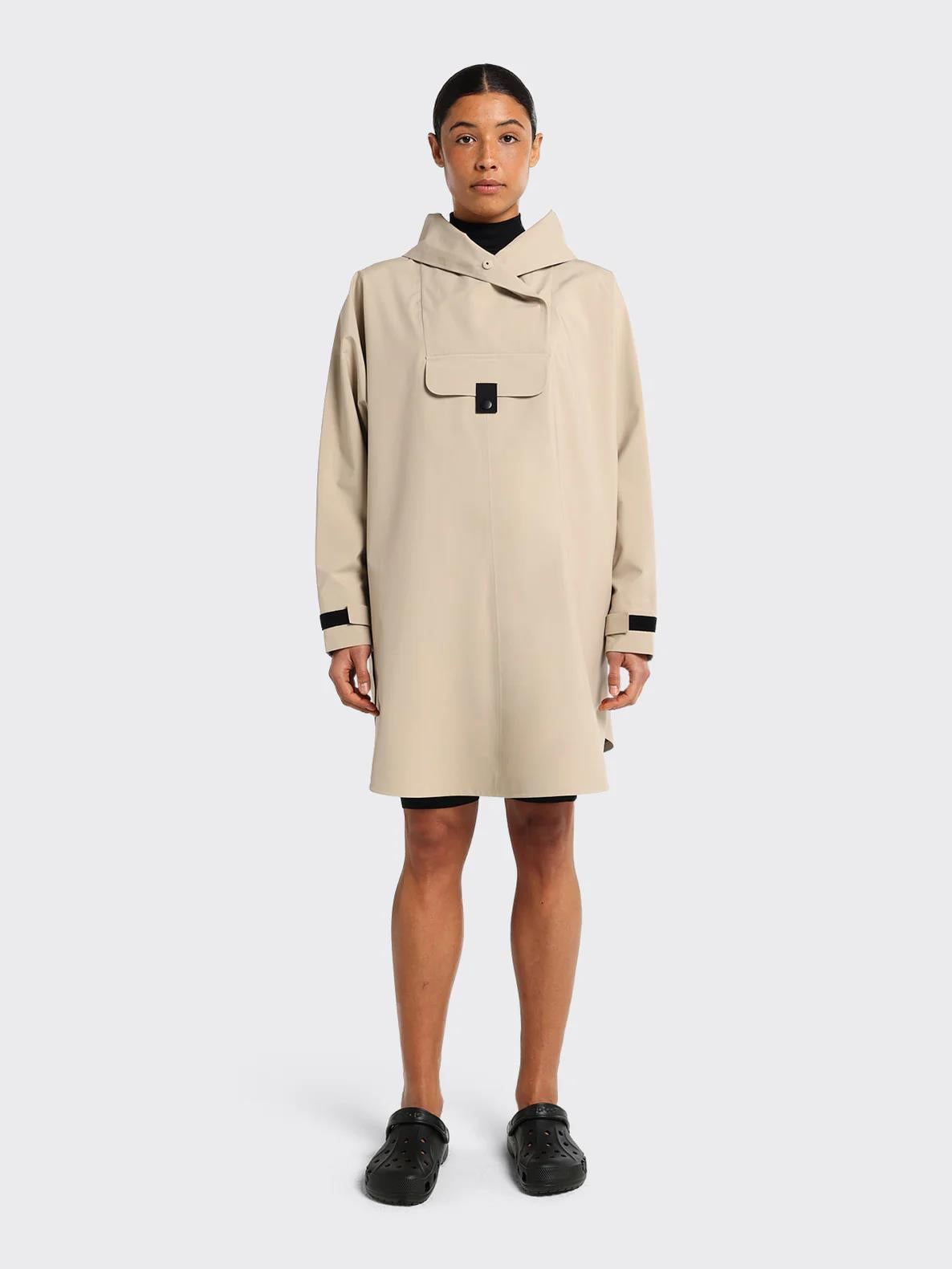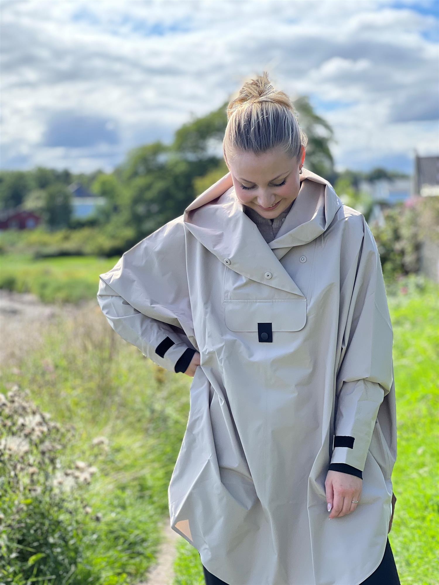 Kul vanntett regnponcho i beige fra BLÆST. Ponchoen har justerbar hette og en lomme foran med glidelåslukking. Regnponchoen er pustende (10.000/24 timer), vanntett (20.000mm), vindtett og vannavstøtende.
