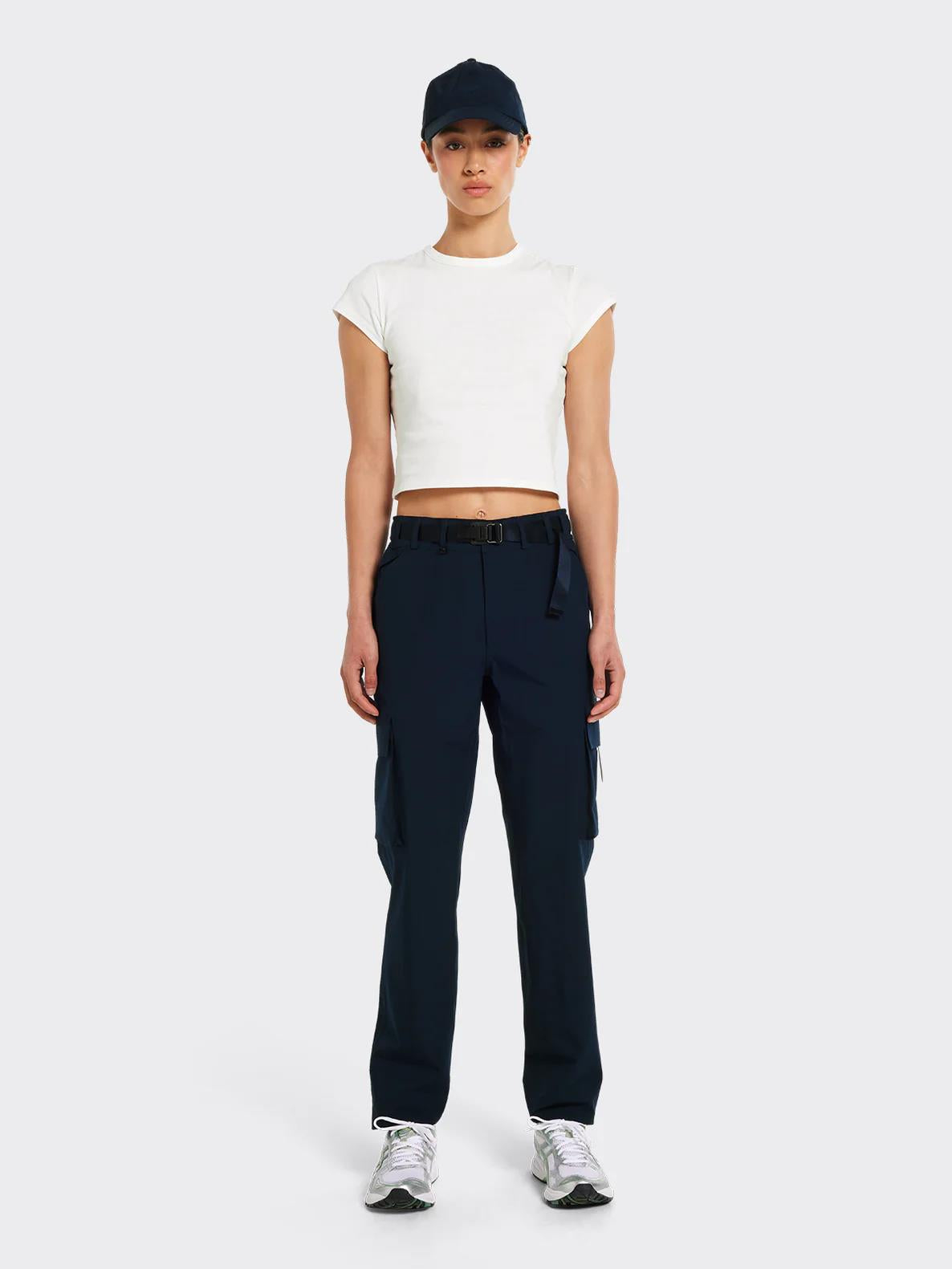 Buksen har lommer foran, bak og på siden og et justerbart belte i livet.