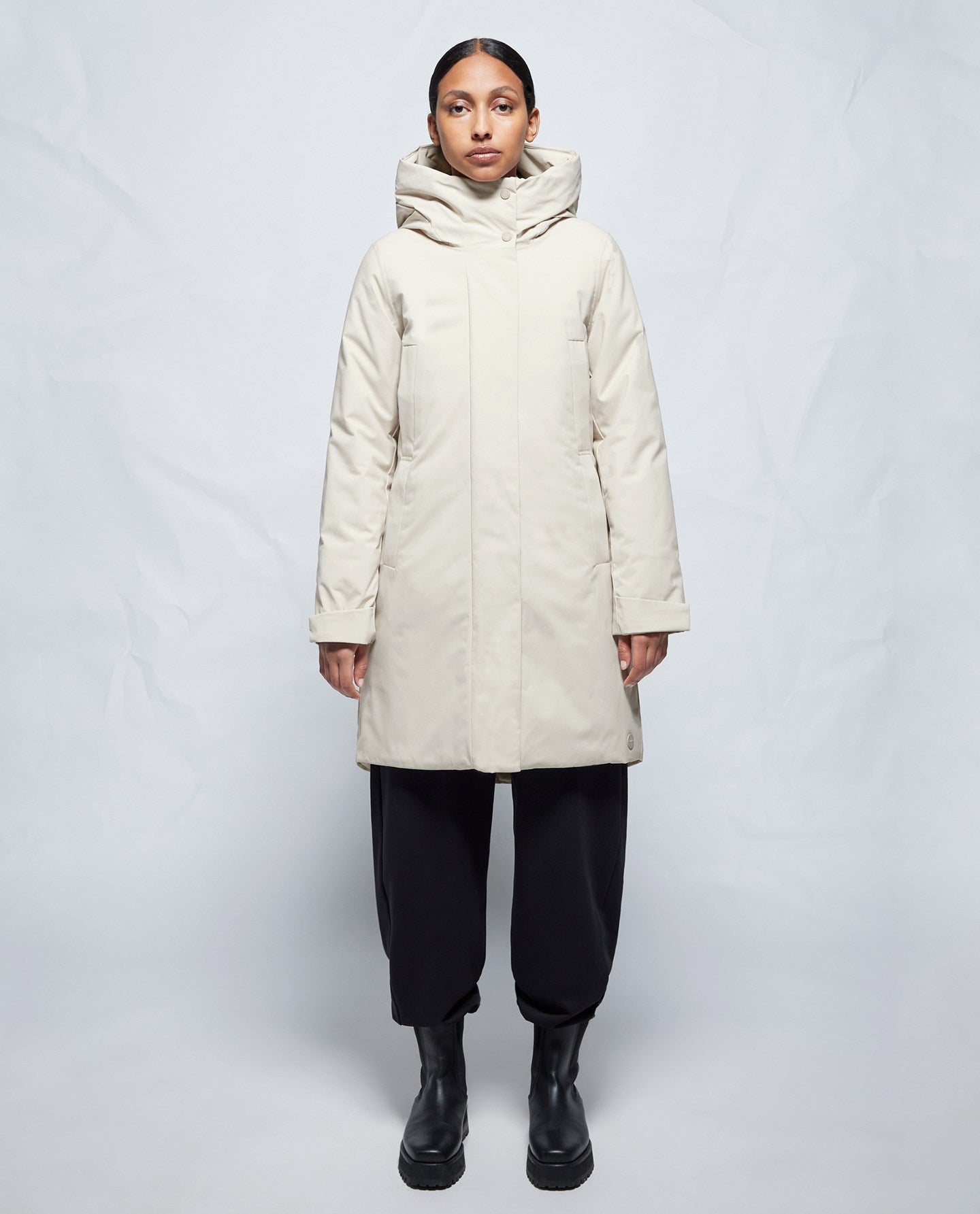 - Eline is a hooded winter jacket with a fitted silhouette made in a Pet Poly 5K fabric. The material is quick-drying and has a waterproof membrane that protects from sudden downpour. The 4-way stretch adds comfort while a brilliant colour fastness maintains the jacket’s fresh look from one season to another. Details include double welt pockets and vital taped seams. Eline brings a sophisticated, active look in cold city winters. The model is 178 cm tall and wearing a size S. Length of winter jacket: 96 cm (size S). Waterproof recycled polyester fabric with mechanical stretch, 5 000 mm water column.
