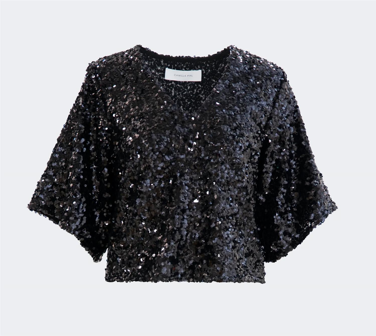 The Tony Sequin Top is a loose-fitting sequin top featuring gracefully flared sleeves and a deep V-neckline.