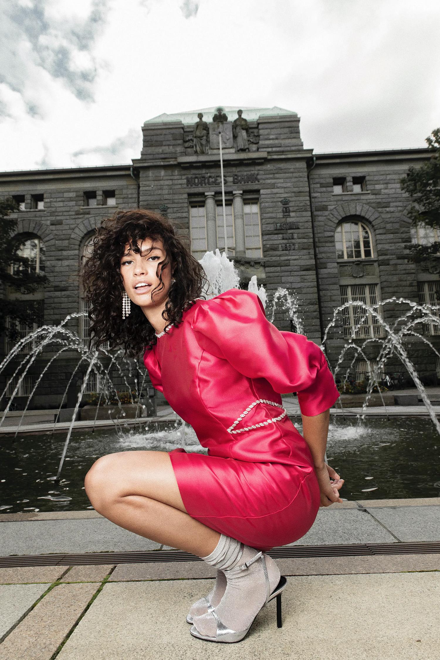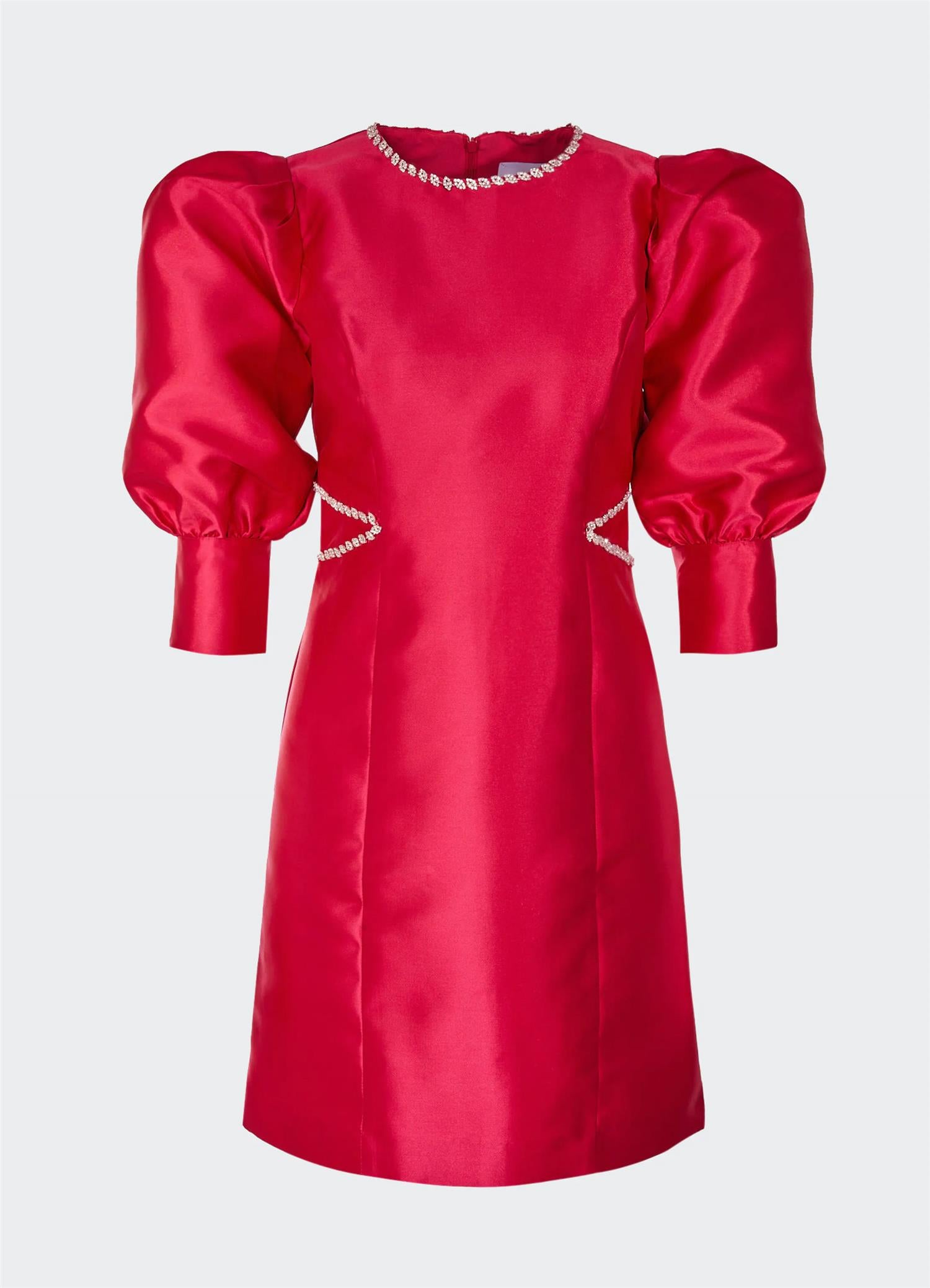 Introducing the Jaqueline Dress. A fitted dress designed with puffed sleeves and embellished details at neck and in the waistline. Comes with zipper at center back.