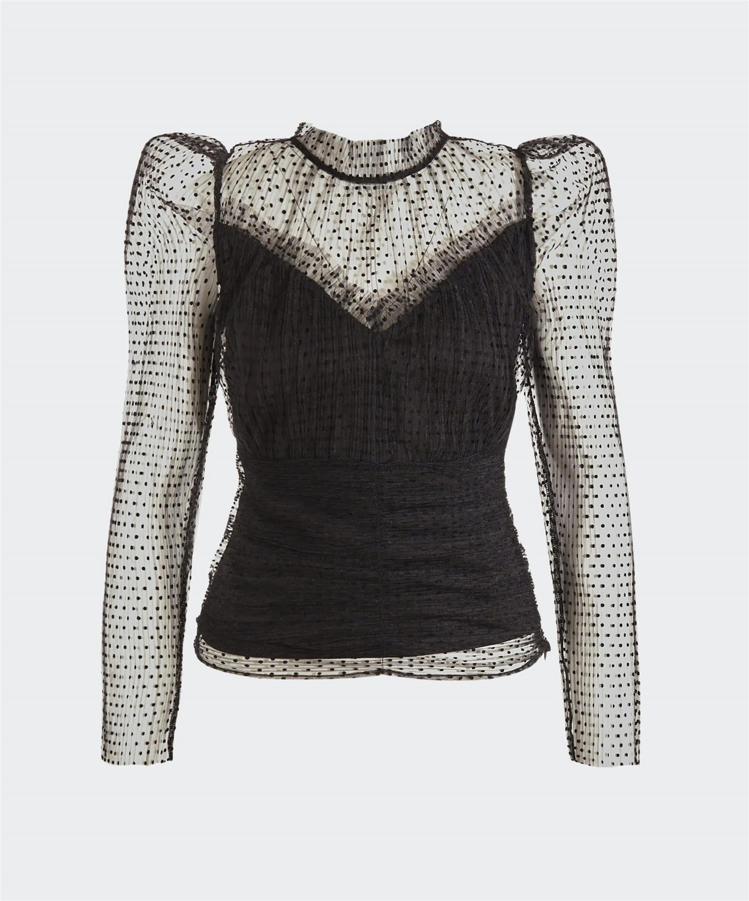 Janet top is designed with ruched details in dot mesh fabric.